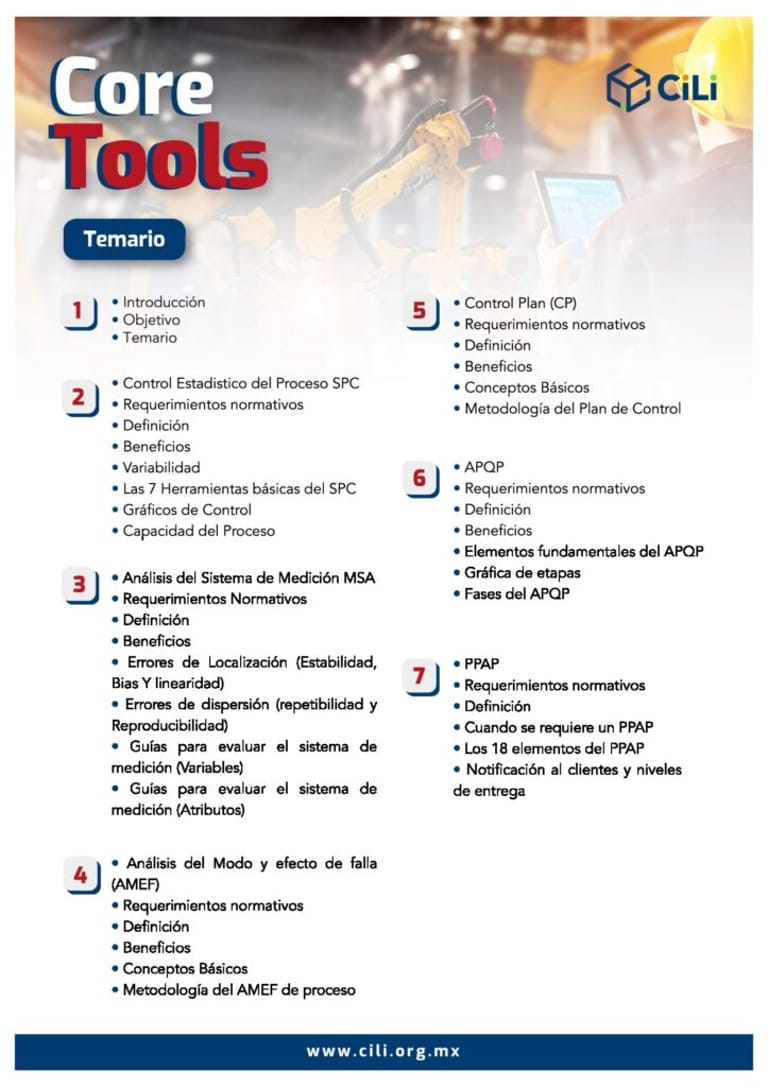 Las Core Tools (AMEF, MSA, SPC, APQP, PPAP) son las herramientas necesarias para implantar un Sistema de Gestión de Calidad de la Industria Automotriz. Se desarrollan con el objetivo de satisfacer las necesidades del cliente y obtener el máximo beneficio de la implementación de la norma IATF 16949.